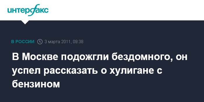 Москва. 3 марта. INTERFAX.RU - На северо-западе Москвы неизвестный мужчина облил бензином и поджег бомжа, которому чудом удалось выжить, сообщил "Интерфаксу" в четверг источник в правоохранительных органах.