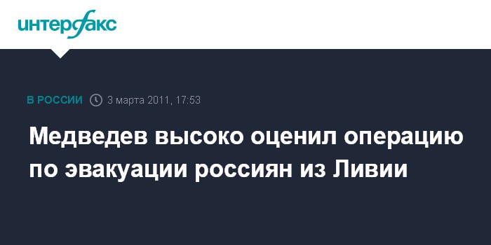 "Ливия находится на пороге гражданской войны. Во время таких событий обычно проходит полная дезорганизация управления государством, что и наблюдается сейчас. Поэтому задача спасения наших граждан из этой страны заслуживает самой высокой оценки", - заявил Медведев.