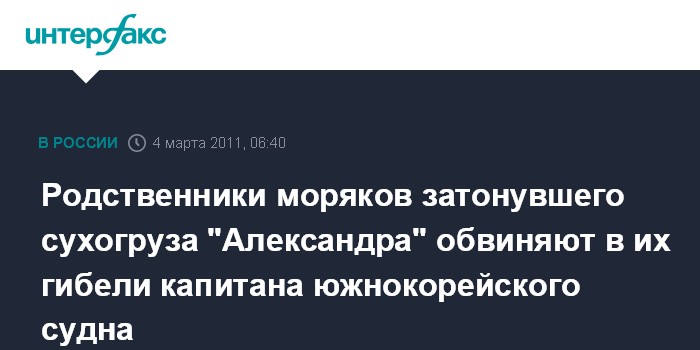 Владивосток. 4 марта. ИНТЕРФАКС-ДАЛЬНИЙ ВОСТОК - Родственники моряков сухогруза "Александра", затонувшего у берегов Южной Кореи в начале февраля, считают виновным в их гибели капитана южнокорейского судна, и готовы отстаивать свое мнение в корейском суде.