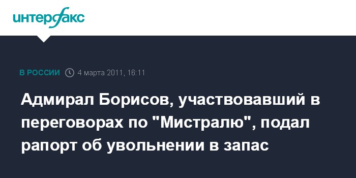 Адмирал Борисов, участвовавший в переговорах по "Мистралю", подал рапорт об увольнении в запас