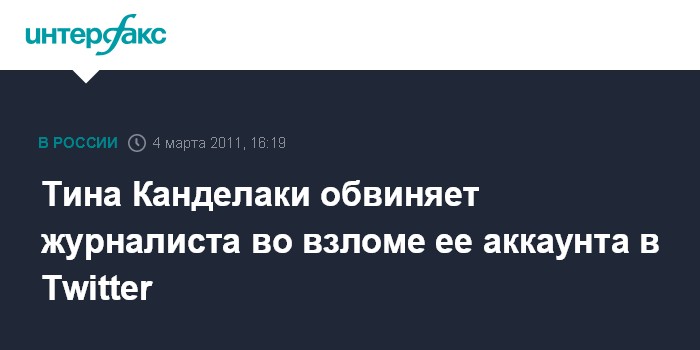 Москва. 4 марта. INTERFAX.RU – Телеведущая Тина Канделаки сообщила в пятницу о взломе ее аккаунта в Twitter-e и публикации фэйковых записей от ее имени, а также о намерении обратиться в связи с этим в правоохранительные органы, обвинив во взломе журналиста радиостанции "Свобода" Мумина Шакирова.