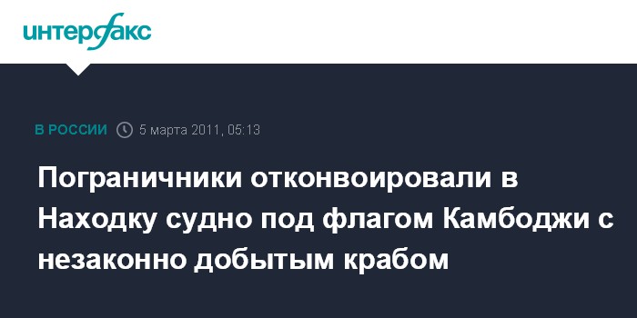 Владивосток. 5 марта. ИНТЕРФАКС-ДАЛЬНИЙ ВОСТОК - В порт города Находки в Приморье приведено камбоджийское судно "Форестер", команду которого подозревают в незаконной добыче краба.