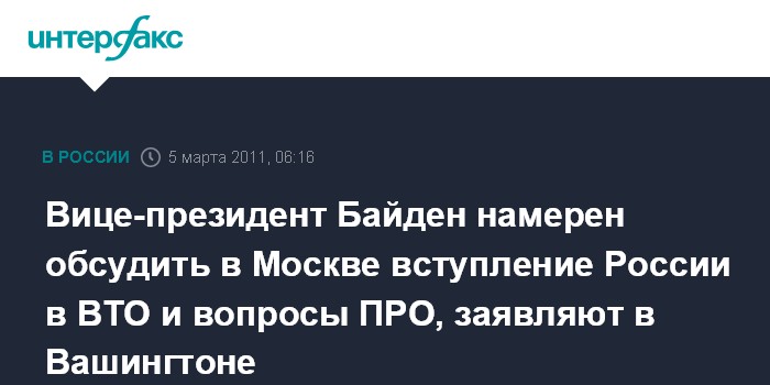 Вице-президент Байден намерен обсудить в Москве вступление России в ВТО и вопросы ПРО, заявляют в Вашингтоне