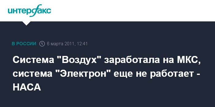 Вашингтон. 6 марта. INTERFAX.RU - Работоспособность российской системы получения кислорода "Электрон-ВМ" на Международной космической станции (МКС) восстановить пока не удается, сообщает Национальное аэрокосмическое агентство США.