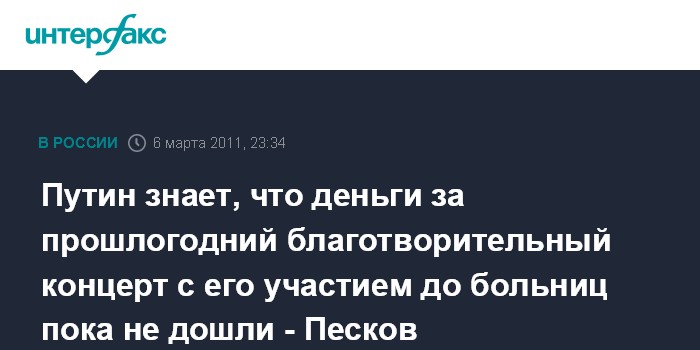 Путин знает, что деньги за прошлогодний благотворительный концерт с его участием до больниц пока не дошли - Песков