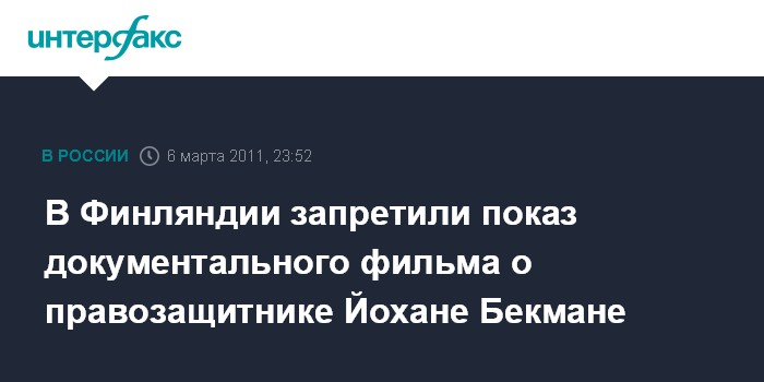 Хельсинки. 6 марта. ИНТЕРФАКС - В Финляндии запрещен показ документального фильма об известном правозащитнике, председателе Антифашистского комитета Финляндии, доценте Хельсинкского университета Йохане Бекмане (Johan Backman).