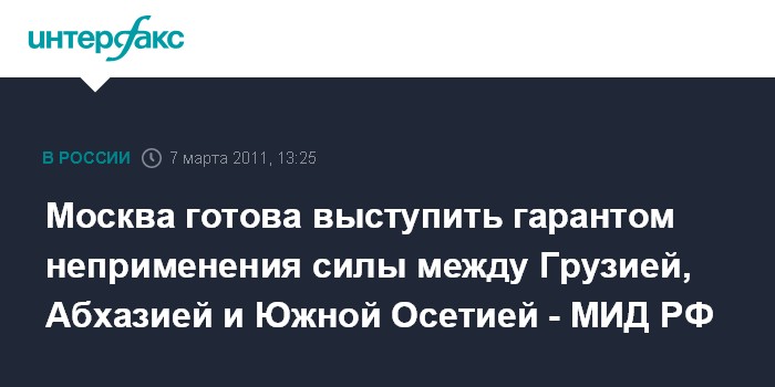 Москва. 7 марта. INTERFAX.RU - Россия на очередном, 15-м раунде Женевских дискуссий по безопасности и стабильности в Закавказье выразила готовность стать одним из гарантов в отношении неприменения силы между Грузией, Абхазией и Южной Осетией, сообщают в МИД РФ.
