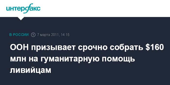Нью-Йорк (ООН). 7 марта. INTERFAX.RU - ООН инициировала в понедельник программу по срочному сбору средств на гуманитарные нужды для ливийцев. По оценкам ООН, необходимо собрать $160 млн. как на помощь беженцам, так и на оказание помощи людям в обеих частях Ливии - как в районах, контролируемых властями страны, и в районах, удерживаемых оппозицией. Кроме того, из этих средств планируется провести подготовку на случаю худшего сценария, когда поток беженцев из Ливии возрастет значительно.