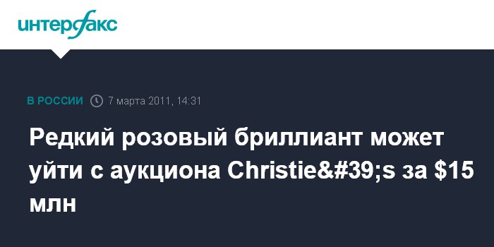 Нью-Йорк. 7 марта. INTERFAX.RU - Пурпурно-розовый бриллиант весом 10,09 карата может стать ключевым лотом на аукционе Christie's Magnificent Jewels ("Великолепные драгоценности"), который состоится в Нью-Йорке в апреле. Как пишет Anwerp Facets, бриллиант с наивысшей классификацией интенсивности цвета ("ярко-фантазийный" (fancy vivid)) может быть продан за $15 млн.