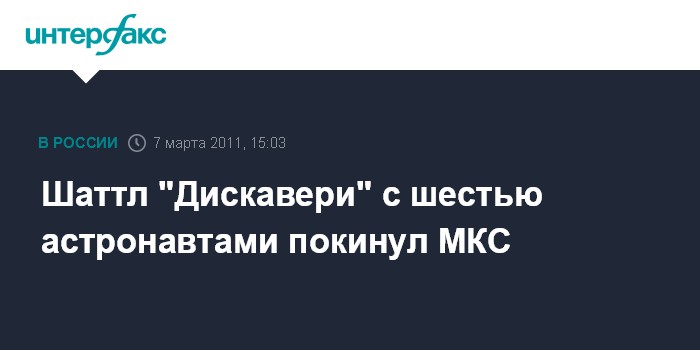 Вашингтон. 7 марта. INTERFAX.RU - Американский шаттл "Дискавери", совершающий свой последний полет, в понедельник отстыковался от Международной космической станции (МКС), через два дня он должен вернуться на Землю, сообщает Национальное аэрокосмическое агентство США. По данным НАСА, корабль отчалил от станции в 15:00 мск. На его борту шесть американских астронавтов: Стивен Линдси (командир), Эрик Боу, Элвин Дрю, Стивен Боуэн, Майкл Барратт и Николь Стотт.