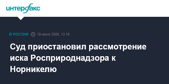 Москва. 19 июня. INTERFAX.RU - Арбитражный суд Красноярского края принял решение приостановить рассмотрение дела по иску Росприроднадзора к ГМК "Норильский никель" о возмещении ущерба на 4,4 млрд руб., сообщила "Интерфаксу" пресс-секретарь суда Валентина Безруких.