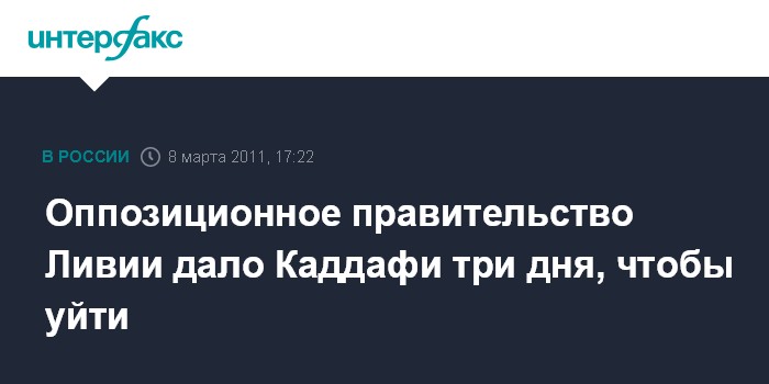 Лондон. 8 марта. INTERFAX.RU - Национальный совет Ливии, выполняющий функции оппозиционного правительства, дал Муамару Каддафи три дня, чтобы добровольно отказаться от власти, сообщает во вторник британская телерадиокорпорация Би-би-си. "Если Каддафи прекратит бомбардировки и уйдет в течение 72 часов, мы, ливийцы, не будем преследовать его за совершенные им преступления", - заявил глава Национального совета Мустафа Мухаммед Абдель Джилиль.