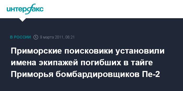 Владивосток. 9 марта. ИНТЕРФАКС-ДАЛЬНИЙ ВОСТОК - Специалистам общественного объединения "АвиаПоиск" в Приморье удалось установить имена летчиков двух экипажей пикирующих бомбардировщиков Пе-2, разбившихся во второй половине 40-х годов прошлого столетия в тайге Партизанского района края.