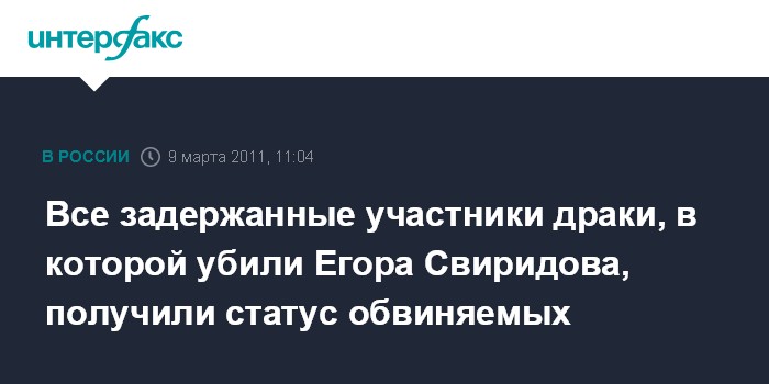 Москва. 9 марта. INTERFAX.RU - Последнему участнику драки, в которой в декабре был убит болельщик московского "Спартака" Егор Свиридов, предъявлено обвинение в хулиганстве и нанесении побоев, сообщил "Интерфаксу" официальный представитель СК РФ Владимир Маркин.