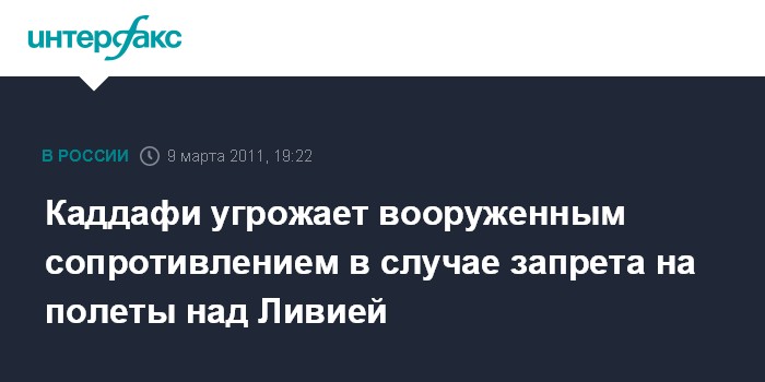 Стамбул. 9 марта. INTERFAX.RU - Ливийский лидер Муамар Каддафи в интервью турецкому телеканалу TРT предупредил, что окажет вооруженное сопротивление в случае объявления воздушного пространства над Ливией зоной, закрытой для полетов.