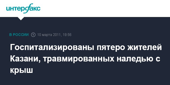 Казань. 10 марта. INTERFAX.RU - Шестеро женщин пострадали в четверг в Казани от упавших с крыш зданий и козырьков балконов пластов снега, наледей и сосулек, сообщили агентству "Интерфакс-Поволжье" на городской станции "Скорой помощи".