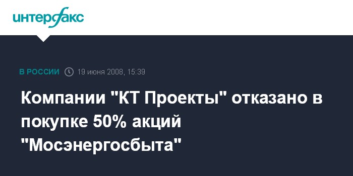 Москва. 19 июня. INTERFAX.RU - Федеральная антимонопольная служба РФ (ФАС) отказала в удовлетворении ходатайства ООО "ИК "КТ Проекты" о приобретении 50,9% голосующих акций ОАО "Мосэнергосбыт", говорится в сообщении ФАС.