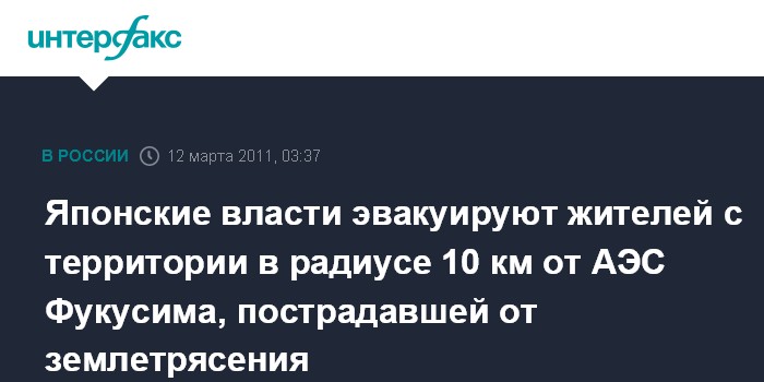 Лондон. 12 марта. ИНТЕРФАКС - Премьер-министр Японии Наото Кан распорядился эвакуировать всех людей, проживающих в пределах 10 км вокруг АЭС Фукусима Даичи, сообщает британская телерадиокорпорация Би-би-си со ссылкой на японское агентство Киодо.