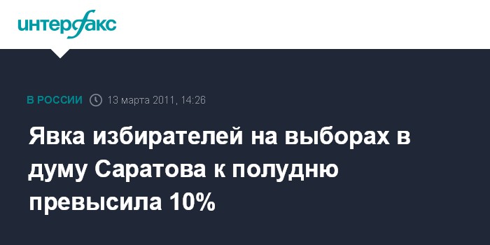 Саратов. 13 марта. INTERFAX.RU - Явка избирателей на выборах депутатов в Саратовскую городскую думу на 12:00 мск составила 10,47%, сообщила в воскресенье агентству "Интерфакс-Поволжье" начальник информационного центра областной избирательной комиссии Ольга Федосова. "Самая высокая явка избирателей отмечена в округе N8 (Кировский район) - 18,65%. Самая низкая явка отмечена в округе N16 (Ленинский район) - 6,39%", - уточнила представитель облизбиркома.