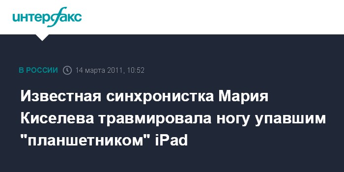 "Знаменитая спортсменка обратилась в субботу днем в одну из частных клиник на востоке Москвы. Врачам Киселева сообщила, что накануне она уронила себе на ногу iPad", - сказал собеседник агентства.