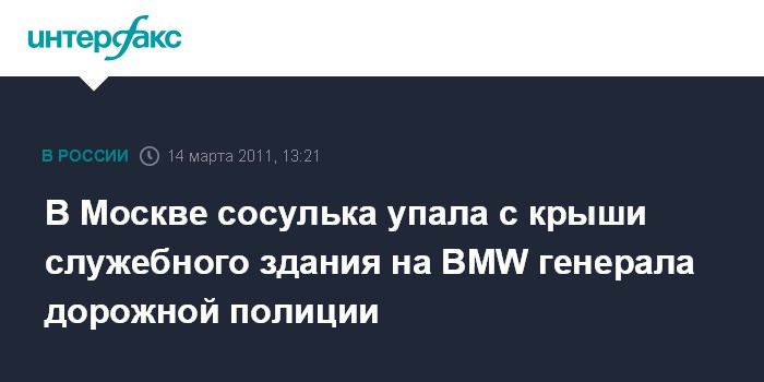 Москва. 14 марта. INTERFAX.RU - В центре Москвы, возле здания департамента дорожной полиции МВД России рухнувшей с его крыши глыбой льда повреждена служебная машина заместителя начальника департамента, генерал-майора Виктора Нилова.