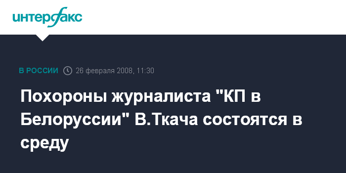 Минск. 26 февраля. INTERFAX.RU - Похороны Вячеслава Ткача, корреспондента "Комсомольской правды в Белоруссии" состоятся 27 февраля на кладбище в Марьиной Горке под Минском. Процедура прощания с телом журналиста состоится в Минске в ритуальном зале на ул. Ольшевского 27 февраля с 10.00 до 12.00 сообщили "Интерфаксу" в редакции "Комсомолки".