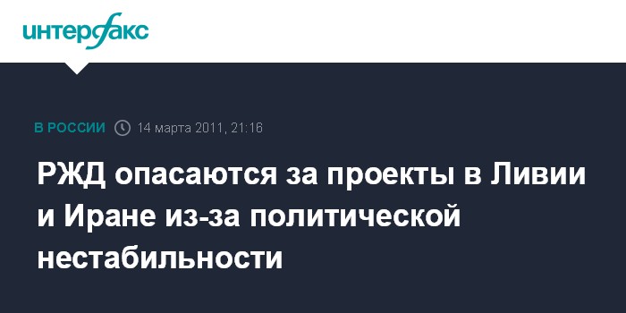 Москва. 14 марта. INTERFAX.RU+ - ОАО "Российские железные дороги" (РЖД) опасается, что обострившаяся политическая ситуация в Северной Африке поставит под угрозу проекты компании в странах этого региона.