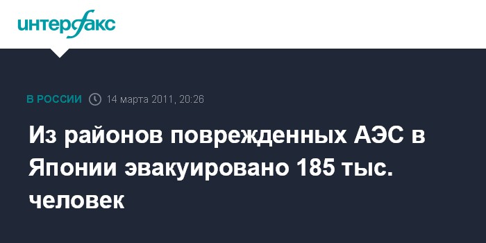 Вена. 14 марта. INTERFAX.RU - Из 20-километровой зоны в районе поврежденных АЭС в Японии эвакуировано около 185 тыс. человек, сообщает МАГАТЭ.