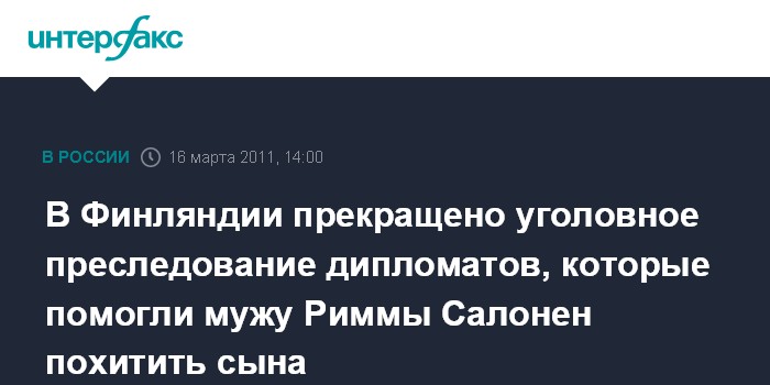 Таллин. 16 марта. INTERFAX.RU - Центральная уголовная полиция (ЦУП) Финляндии закрыла уголовное дело в отношении дипломатов Олли Перхеэнтупа и Симо Пиетилянена, содействовавших похищению из России сына россиянки Риммы Салонен.