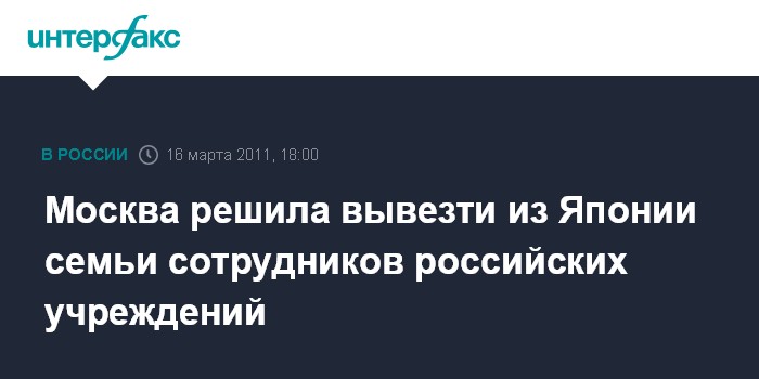 "В связи со складывающейся в Японии обстановкой принято решение о временном выезде из страны ориентировочно 18 марта членов семей сотрудников российских учреждений в Японии, включая посольство в Токио, генеральные консульства, торговое представительство и ряд других", - говорится в сообщении, опубликованном на сайте МИД РФ в среду.