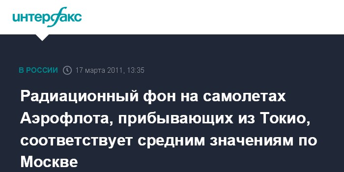 Москва. 17 марта. INTERFAX.RU - Нормы радиации на воздушных судах ОАО "Аэрофлот - российские авиалинии", прибывающих из Токио, соответствуют средним фоновым значениям по Москве и Московской области, говорится в сообщении авиаперевозчика.