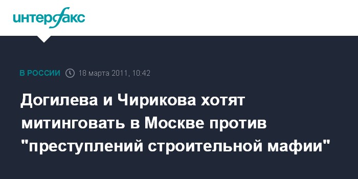 Москва. 18 марта. INTERFAX.RU – Российская актриса Татьяна Догилева и лидер движения в защиту Химкинского леса Евгения Чирикова намерены подать в московскую мэрию заявку на проведение 3 апреля на Пушкинской площади митинга "Против преступлений строительной мафии".