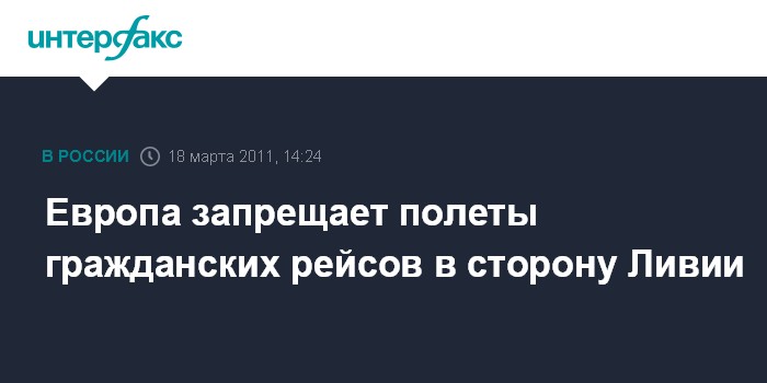 Брюссель. 18 марта. INTERFAX.RU - Европейское агентство аэронавигационного контроля "Евроконтроль" в пятницу объявило о введении запрета на полеты гражданских авиарейсов в сторону Ливии.