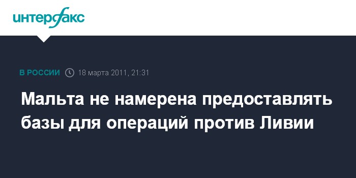 Рим. 18 марта. ИНТЕРФАКС - Власти Мальты предупредили в пятницу вечером, что не намерены предоставлять базы для проведения международных военных операций в Ливии, сообщает веб-сайт итальянской газеты La Repubblica.