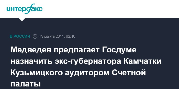 Медведев предлагает Госдуме назначить экс-губернатора Камчатки Кузьмицкого аудитором Счетной палаты