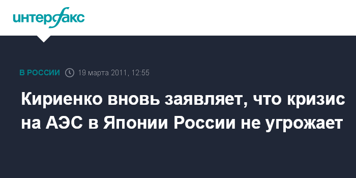 Москва. 19 марта. INTERFAX.RU - Ситуация на атомной электростанции "Фукусима-1" не угрожает России, заявил глава Росатома Сергей Кириенко. "Я давно говорил, что России она не угрожает ни при каких условиях", - сказал С.Кириенко журналистам, отвечая в субботу на вопрос "Интерфакса", представляет ли угрозу для России ситуация на этой АЭС. "В настоящее время, - подчеркнул он, - угрозы нет тем более".