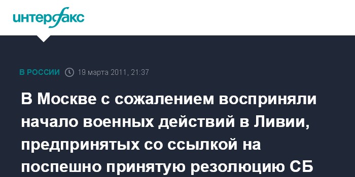 Москва. 19 марта. ИНТЕРФАКС - Военные действия в Ливии в Москве воспринимают с сожалением, говорится в заявлении официального представителя МИД России Александра Лукашевича.