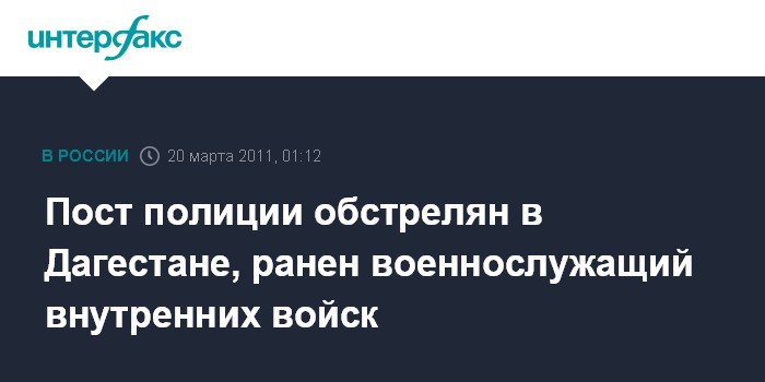 Ростов-на-Дону. 20 марта. ИНТЕРФАКС-ЮГ - Неизвестные в ночь на воскресенье обстреляли контрольный пост полиции в населенном пункте Черняевка Кизлярского района Дагестана, ранен военнослужащий внутренних войск, сообщили агентству "Интерфакс-Юг" в Кизлярском РОВД.