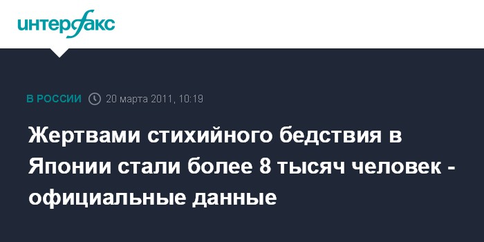 Токио. 20 марта. INTERFAX.RU - Землетрясение и цунами, обрушившиеся на Японию 11 марта, унесли жизни 8 тыс.199 человек, более 12 тыс. 700 человек числятся пропавшими без вести, сообщает Национальное полицейское агентство Японии в воскресенье. По официальным данным ведомства на 09:00 мск, почти 4,9 тыс. человек погибли в префектуре Мияги, более 2,5 - в префектуре Иватэ. Пострадали, согласно официальным данным, более 2,6 тыс. человек.