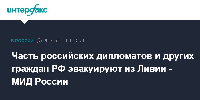 Москва. 20 марта. INTERFAX.RU - Частичная эвакуация сотрудников российской дипмиссии проводится в связи с обострением ситуации в Ливии, сообщает МИД РФ. "По данным посольства России в Триполи, пострадавших среди сотрудников дипмиссии и российских граждан, остающихся в Ливии, нет", - говорится в сообщении российского внешнеполитического ведомства, распространенном в воскресенье. "С учетом развития обстановки состав посольства России в Триполи оптимизируется. Часть его сотрудников и другие российские граждане будут эвакуированы в ближайшие дни автотранспортом через Тунис", - заявили в МИД РФ.