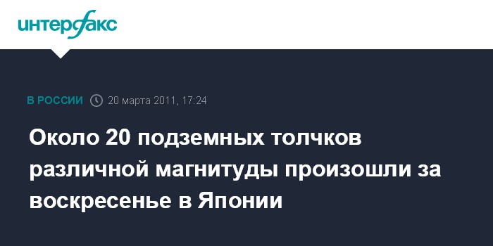 Токио. 20 марта. INTERFAX.RU - По данным Европейско-средиземного сейсмологического центра (EMSC) за воскресенье 20 марта в Японии было зафиксировано 19 подземных толчков магнитудой от 4,6 до 5,8. В основном они фиксировались в районе восточного побережья острова Хонсю. Так, по данным центра, с разницей около 30 минут в Японии произошли два подземных толчка - у восточного побережья Хонсю и в западном Хонсю, магнитудой 5 и 5,8 соответственно. Японское метеорологическое агентство не сообщает об опасности цунами.
