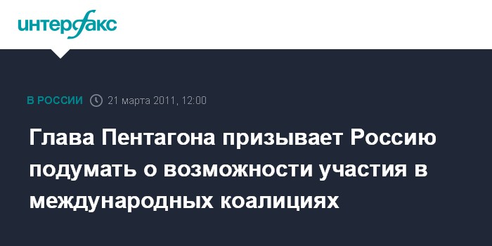 Санкт-Петербург. 21 марта. INTERFAX.RU - Российская Федерация должна найти форму участия своих вооруженных сил в международных коалициях, заявил министр обороны США Роберт Гейтс в понедельник в Петербурге.
