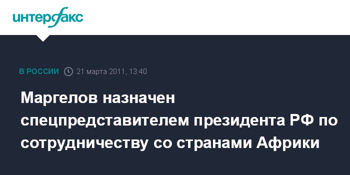 Глава российского государства своим указом назначил Михаила Маргелова специальным представителем президента РФ по сотрудничеству со странами Африки.