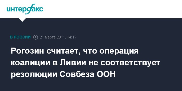 "Считаю, что нанесение ударов по целям, не имеющим отношения к авиации, включая средства ПВО, аэродромы, воздушные цели, - все это выходит за рамки обозначенных целей и не соответствует резолюции Совета Безопасности ООН по Ливии", - сказал Рогозин "Интерфаксу" в понедельник.