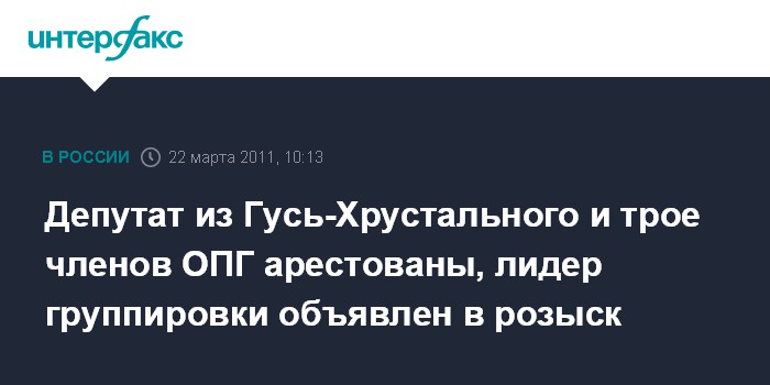 Москва. 22 марта. INTERFAX.RU - Депутат из города Гусь-Хрустальный Владимирской области, жители которого ранее обратились к руководству страны за защитой от криминального засилья в городе, арестован по подозрению в участии в организованной преступной группировке (ОПГ), сообщил официальный представитель СК РФ Владимир Маркин.