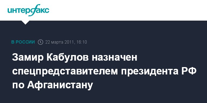 Москва. 22 марта. INTERFAX.RU - Президент России Дмитрий Медведев своим указом назначил директора Второго департамента Азии МИД РФ Замира Кабулова специальным представителем президента РФ по Афганистану, сообщила во вторник пресс-служба главы государства.