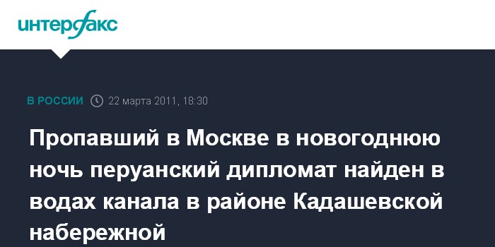 Москва. 22 марта. INTERFAX.RU - В центре Москвы, в водах канала в районе Кадашевской набережной, напротив дома 56 обнаружено тело атташе посольства Перу в Москве Серхио Алонсо Дель Кастильо.