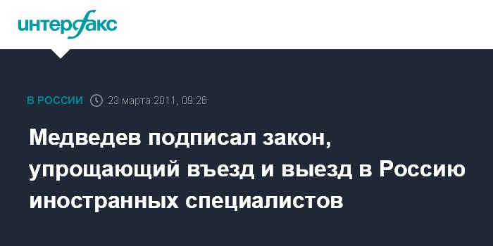 Москва. 23 марта. INTERFAX.RU - Президент России Дмитрий Медведев подписал федеральный закон "О внесении изменений в федеральный закон "О миграционном учете иностранных граждан и лиц без гражданства в РФ" и отдельные законодательные акты РФ", сообщает в среду пресс-служба Кремля.
