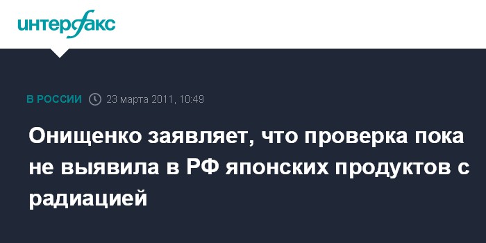 Москва. 23 марта. ИНТЕРФАКС - Радиационный контроль в России пока не выявил пищевой продукции и промышленных товаров из Японии, опасных для здоровья, сообщил "Интерфаксу" в среду руководитель Роспотребнадзора, главный государственный санитарный врач РФ Геннадий Онищенко. "Пока исследования, к счастью, дали отрицательный результат. Пока все, слава Богу, нормально ", - сказал он. По словам Г.Онищенко, на радиацию проверяют самолеты и корабли из Японии. "Мы осматриваем самолеты, которые летят в Москву. Ведется контроль за фильтрами, салонами самолетами, бортовым питанием, твердыми бортовыми отходами, качеством воды", - сказал глава Роспотребнадзора.