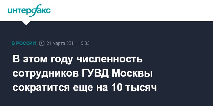 Москва.24 марта. INTERFAX.RU - Численность ГУВД Москвы в этом году сократится на десять тысяч сотрудников в рамках реформы, сообщил, отвечая на вопрос "Интерфакса", начальник столичной полиции Владимир Колокольцев.